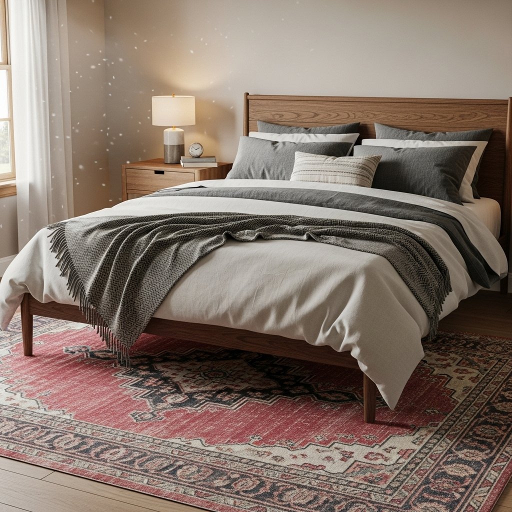 A red rug anchors the room and brings warmth underfoot. Patterns like Persian, geometric, or minimalist designs add visual interest. Muted red rugs blend seamlessly with neutral furniture and flooring. Placing the rug under the bed creates a cohesive and structured layout. This décor choice adds richness while keeping the room grounded and aesthetic.
