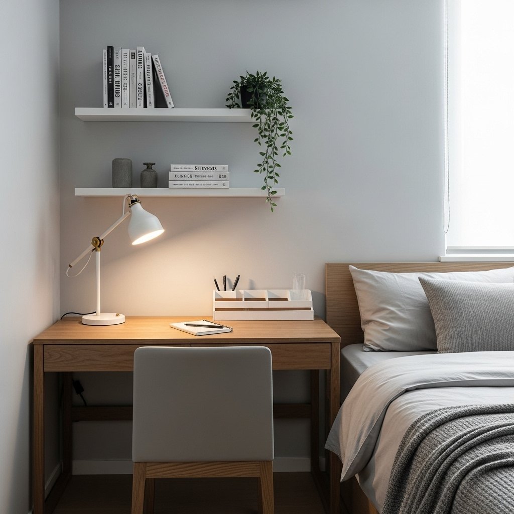 For a simple bedroom, a clean and organized study or work corner is essential. Keep the desk minimal with only essential items like a lamp, notebook, and small organizer. Floating shelves or compact storage can hold books and stationery without crowding the space. A decluttered work area maintains visual calm and promotes productivity. This creates a harmonious balance between style, function, and relaxation.