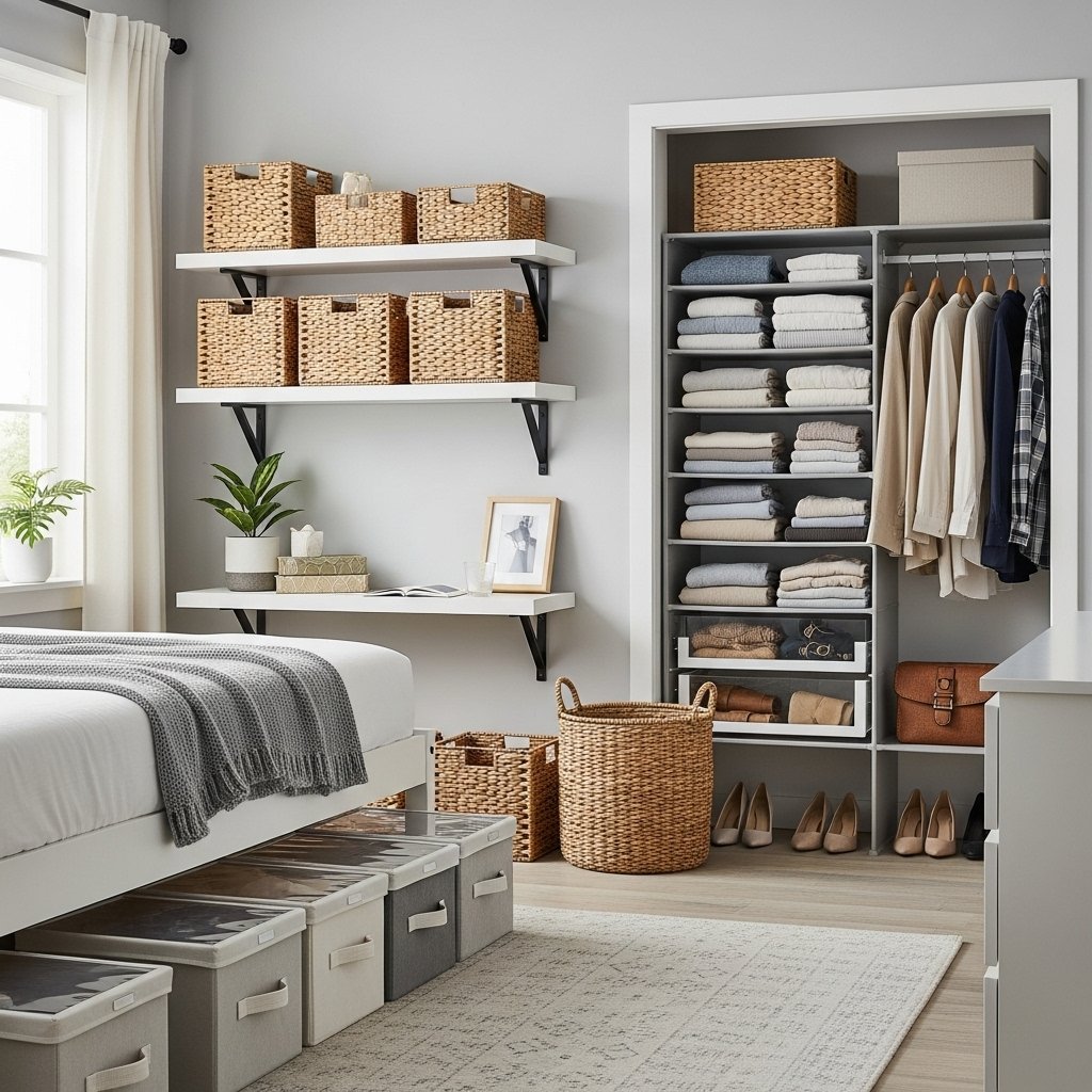 Simple aesthetics thrive on tidy and organized spaces. Utilize storage baskets, shelves, under-bed boxes, and closet organizers to keep belongings neatly out of sight. Decluttered surfaces allow the bedroom to feel larger and more open. Stylish storage solutions also enhance the room’s visual appeal, blending seamlessly with the décor. This ensures the bedroom stays calm, relaxing, and functional.
