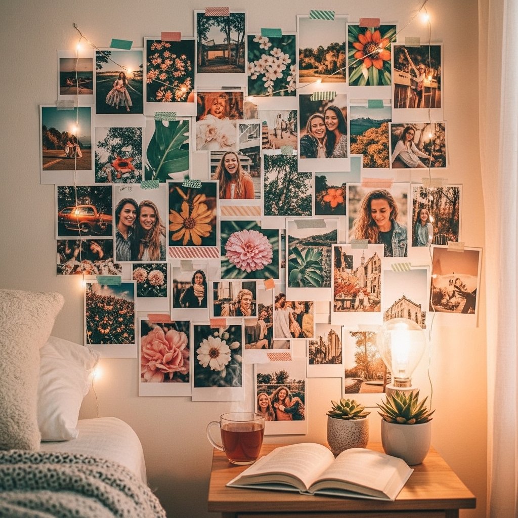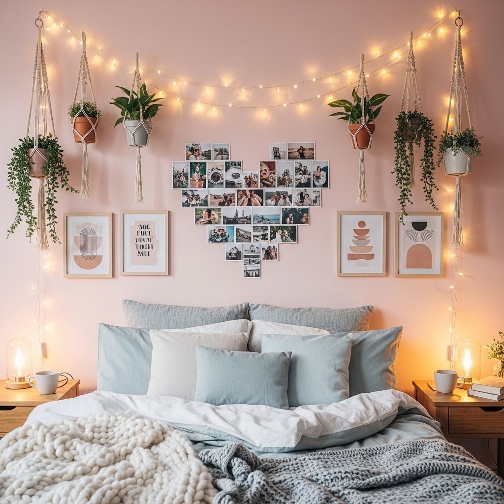 A DIY photo collage wall is one of the most popular aesthetic decor ideas for bedrooms. You can print your favorite memories, inspirational quotes, or aesthetic images and arrange them creatively on your wall. Using fairy lights, clips, or washi tape enhances the visual appeal and gives a cozy vibe. This handmade decor idea allows you to personalize your space while keeping it trendy and meaningful. It’s perfect for creating a Pinterest-inspired bedroom look effortlessly.