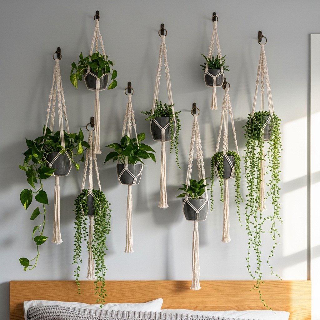 Adding hanging plants to your bedroom wall creates a fresh and natural aesthetic. You can use handmade holders made from macrame, jars, or recycled materials. Plants not only enhance the look of your room but also improve air quality and mood. This decor idea works well with minimalist and boho styles. It brings life and vibrancy to your bedroom effortlessly.