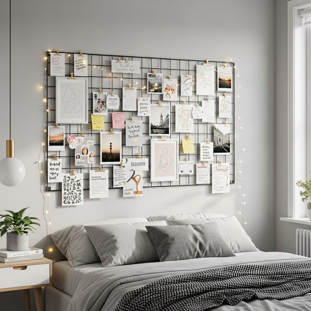 A wall grid panel is a modern and versatile handmade decor idea. You can create one using metal grids or wire frames and customize it with photos, notes, and decorations. Adding clips, lights, or small accessories makes it visually appealing and functional. This decor piece allows you to update your wall design anytime easily. It’s perfect for creating an organized yet stylish bedroom aesthetic.