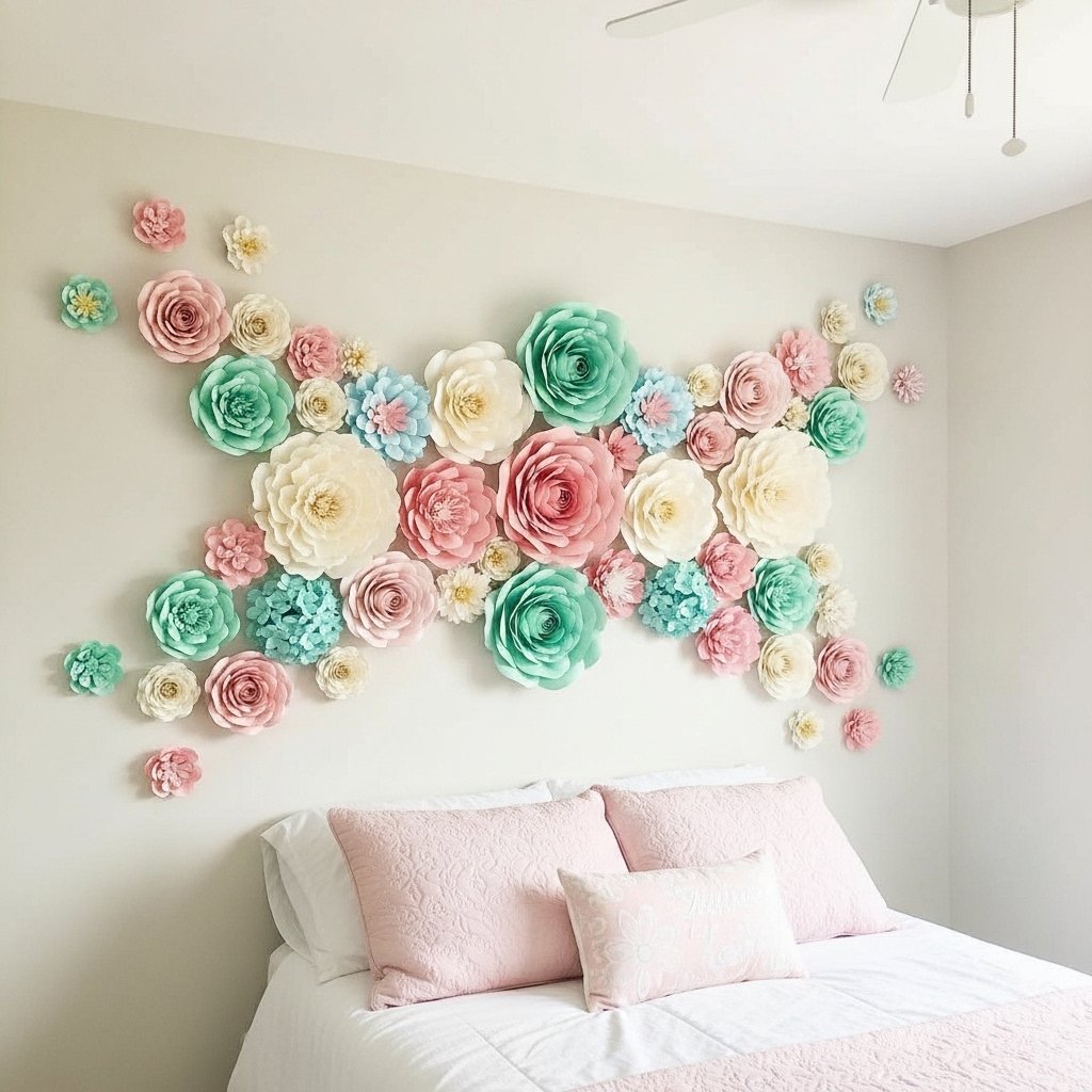 Paper flower walls add a soft, romantic, and artistic touch to any bedroom. You can create flowers using colored paper, tissue paper, or even recycled materials for a budget-friendly option. Arranging them in clusters or patterns makes your wall look elegant and lively. This decor idea works especially well for pastel or feminine aesthetic themes. It’s also a great DIY project that adds dimension and texture to your room.