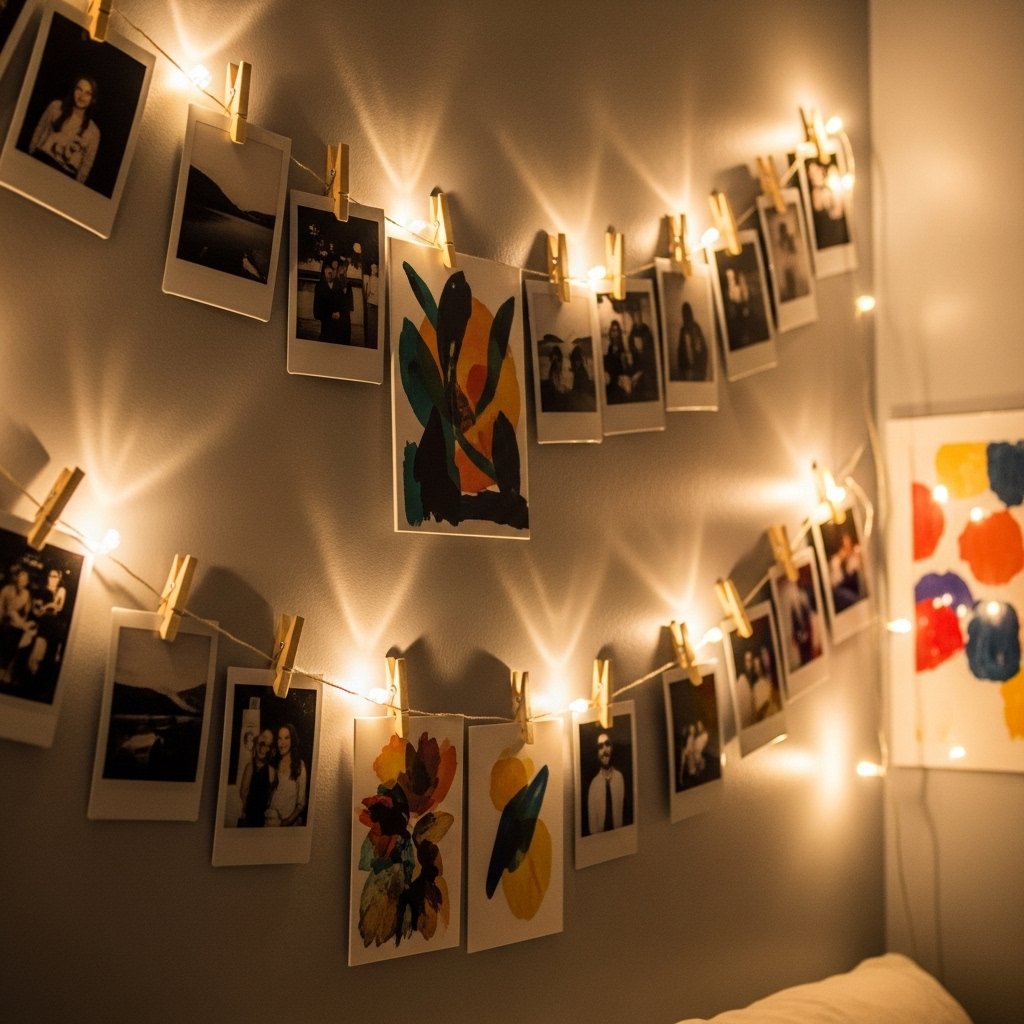 A Polaroid string display is a charming and aesthetic way to decorate your bedroom wall. You can hang photos using strings, fairy lights, or clips for a cozy and personal touch. This idea works well for showcasing memories while adding a warm glow to your space. It’s easy to update and rearrange whenever you want a fresh look. This decor style is perfect for modern and youthful bedroom aesthetics.