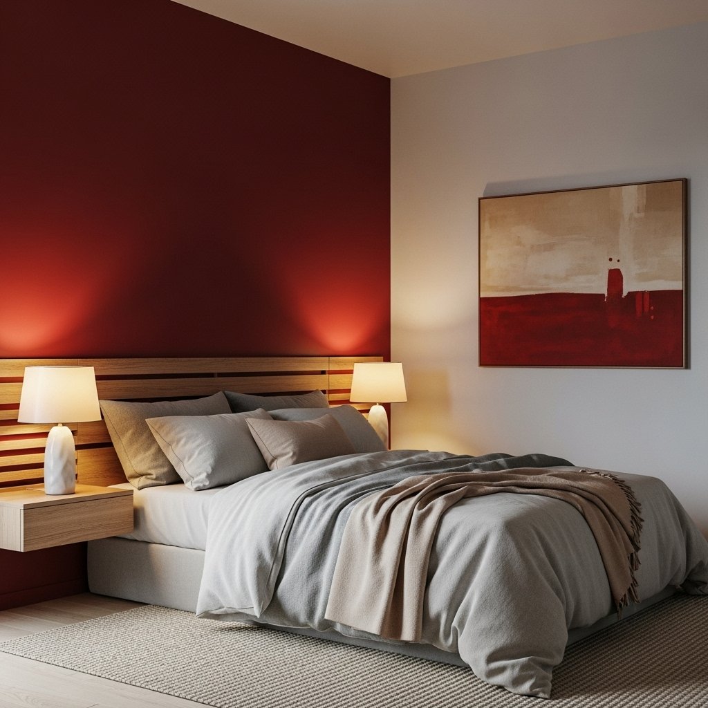 Choosing a deep red shade for a single accent wall instantly adds depth and drama to your bedroom. Pair it with neutral tones such as cream, beige, or soft gray on the other walls to prevent the color from overpowering the room. A deep red wall works perfectly behind a bed as a focal point, creating a cozy and intimate atmosphere. Complement the wall with neutral bedding and warm lighting to balance the bold color. This simple approach makes a statement without compromising comfort or aesthetic appeal.