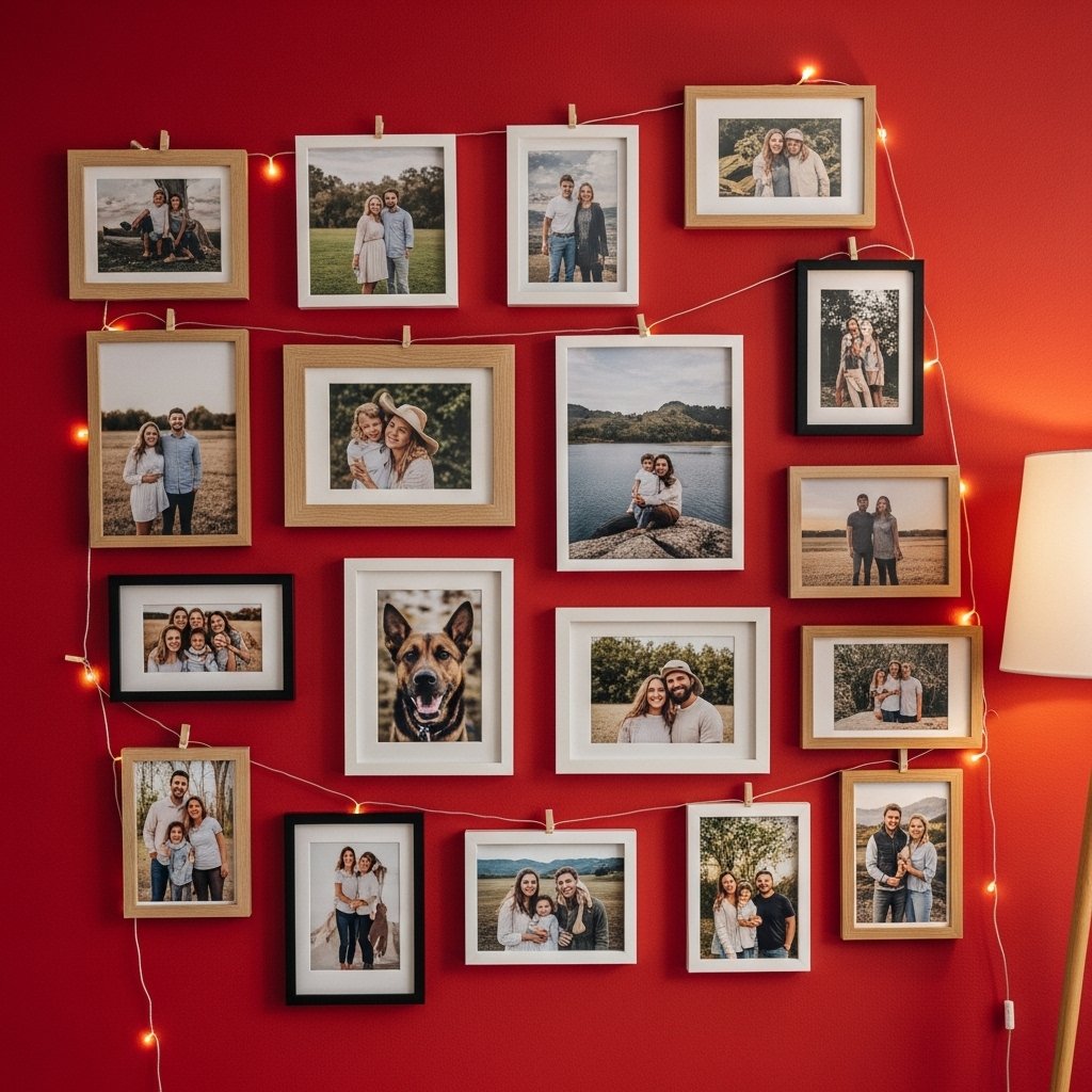 Displaying personal photos on a red accent wall adds warmth, character, and a personal touch to your bedroom. Use neutral-colored frames, string lights, or a grid layout to keep the arrangement cohesive and aesthetic. This approach allows you to showcase memories while maintaining the visual focus on the bold wall. Personal touches make the room feel unique, cozy, and reflective of your personality. It’s a simple yet impactful way to combine style with sentimental value.