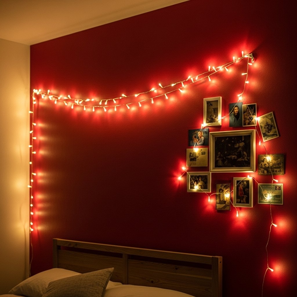 Fairy lights add a soft, dreamy ambiance to a red accent wall, creating an aesthetic and cozy bedroom vibe. String warm white lights across the wall, around the bed, or above a photo collage for a magical touch. The glow softens the intensity of the red color, making the room feel inviting and romantic. Fairy lights also allow for versatile styling, as you can drape them in patterns or around decorative elements. This simple addition instantly enhances the bedroom’s mood and visual appeal.