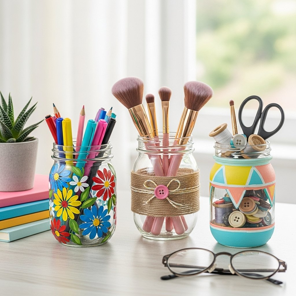 Mason jars can be transformed into versatile storage solutions for a DIY room décor project. Paint them, wrap them in twine, or decorate with ribbons and labels. Use them to store pens, makeup brushes, craft supplies, or small plants. You can also hang the jars on the wall for a floating storage display. This simple DIY adds both functionality and charm to any space.