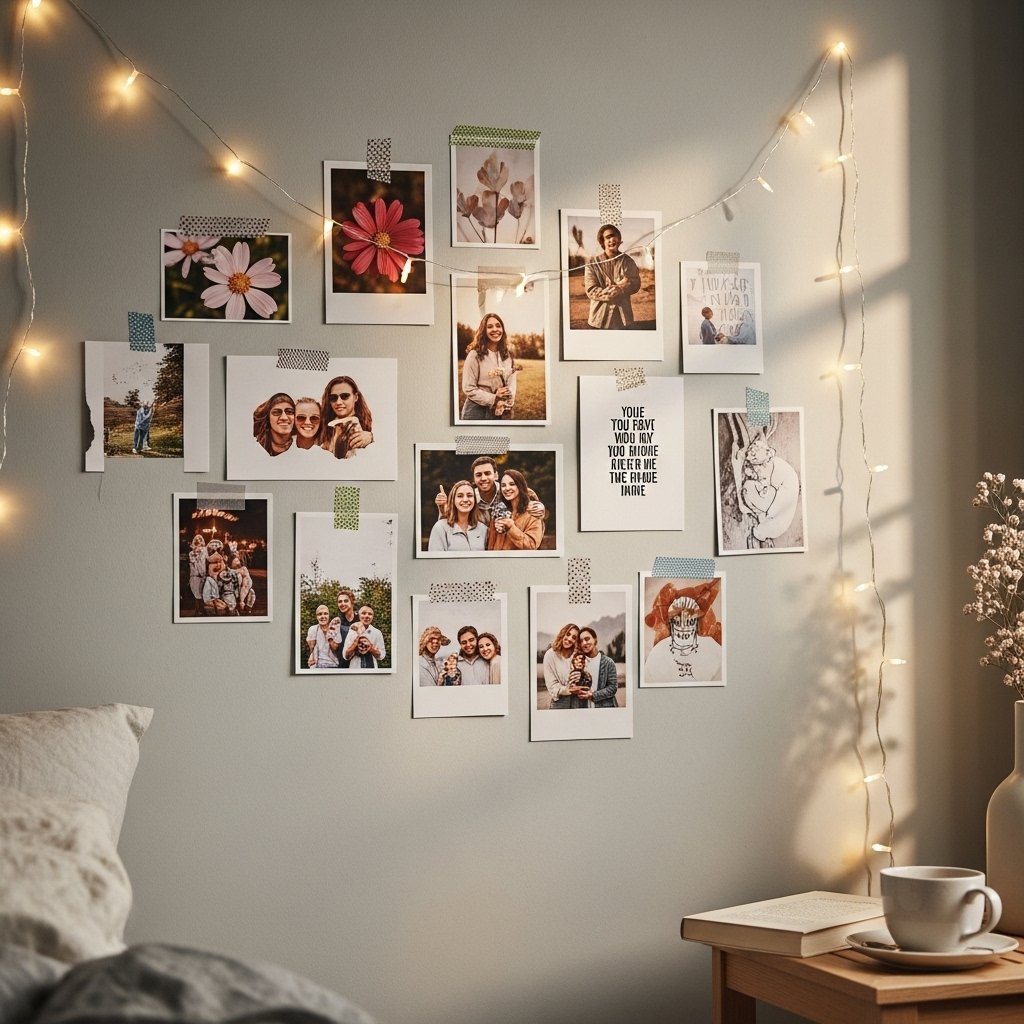 A DIY photo wall collage is a meaningful way to decorate your walls with memories and personality. You can arrange printed photos, postcards, or aesthetic images in a grid or free-form layout. Using washi tape, clips, or frames allows you to change photos easily whenever you want. This wall décor works beautifully in bedrooms, dorm rooms, or study areas. It creates a warm and emotional connection while enhancing the room’s visual appeal.