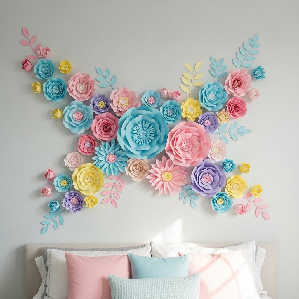 DIY paper flowers are a creative and budget-friendly way to add color and texture to walls. You can make flowers using craft paper, tissue paper, or cardstock in different sizes and shapes. Arranging them in clusters or patterns creates a striking visual effect. This décor idea works especially well for accent walls, behind beds, or creative corners. Paper wall flowers are lightweight, easy to customize, and perfect for a handmade aesthetic.