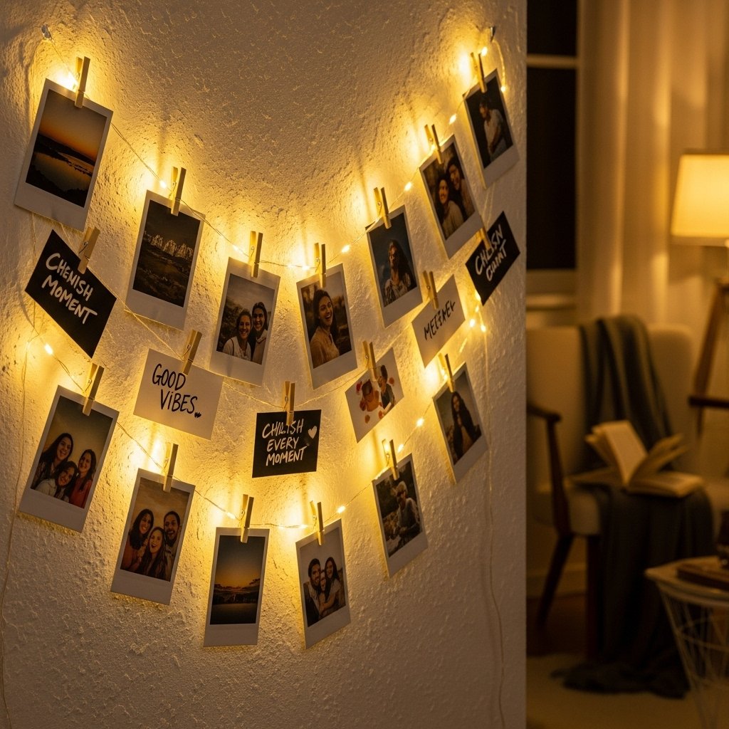 A string light photo wall is a trendy and simple decor idea that instantly brightens up any room. You can hang fairy lights and clip photos, quotes, or Polaroids along the string to create a personalized gallery. This DIY craft looks amazing at night when the lights glow softly, giving the room a warm and cozy vibe. It’s also a great way to display memories with friends and family without damaging the walls. The best part is that you can change the photos anytime, keeping the decor fresh and updated.