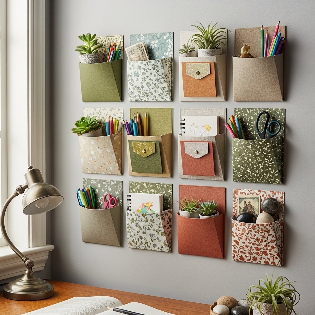 Handmade paper wall pockets combine decor with functionality. Fold and glue paper pockets to hang on walls for storing stationery, plants, or small decorative items. You can decorate the pockets with patterns, cutouts, or layered textures to match the room’s aesthetic. This idea is perfect for study areas, craft rooms, or entryways where space-saving decor is valuable. Paper organizers turn functional storage into a creative wall display, blending style and practicality effortlessly.