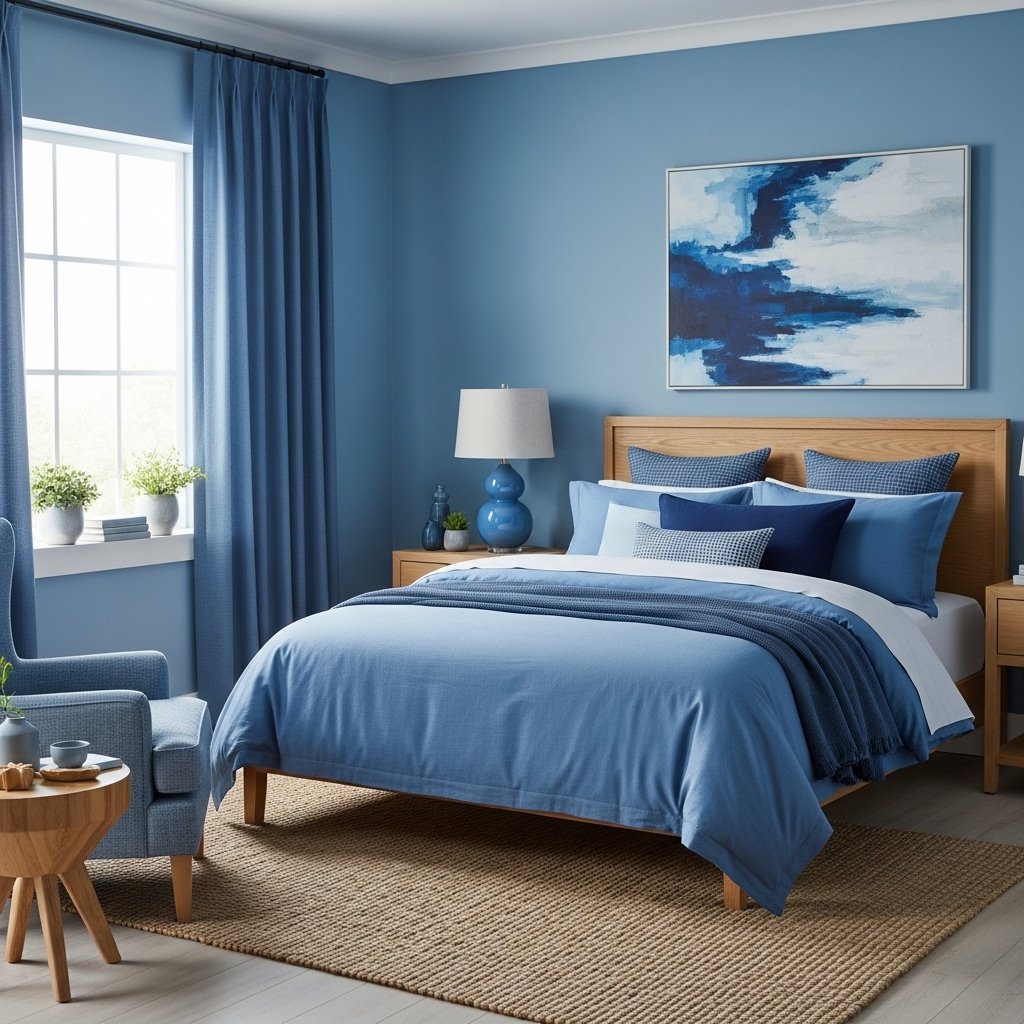 A fully coordinated blue-themed bedroom can create a peaceful and harmonious environment. Combining blue walls, bedding, curtains, and accessories ensures a consistent and relaxing look. You can play with different shades of blue to avoid monotony while keeping the theme intact. Adding natural elements like plants or wooden furniture enhances the overall aesthetic. This setup is perfect for anyone who loves a calm and cohesive interior style.