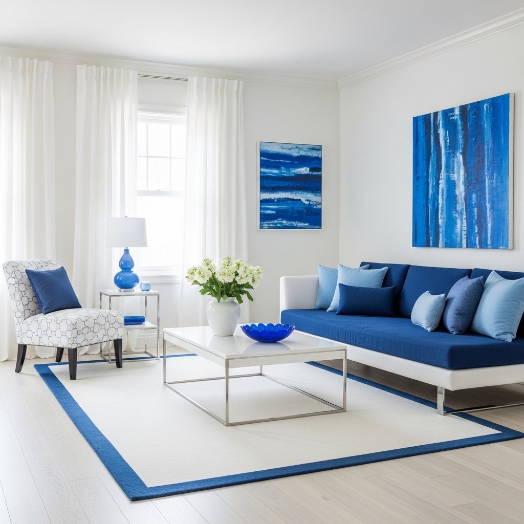 The combination of blue and white is a timeless and elegant decor choice. White furniture paired with blue accents creates a fresh and balanced look that never goes out of style. You can use blue cushions, rugs, or curtains to add subtle pops of color. This style works especially well in modern and coastal-themed interiors. The contrast between blue and white keeps the room visually clean and sophisticated.