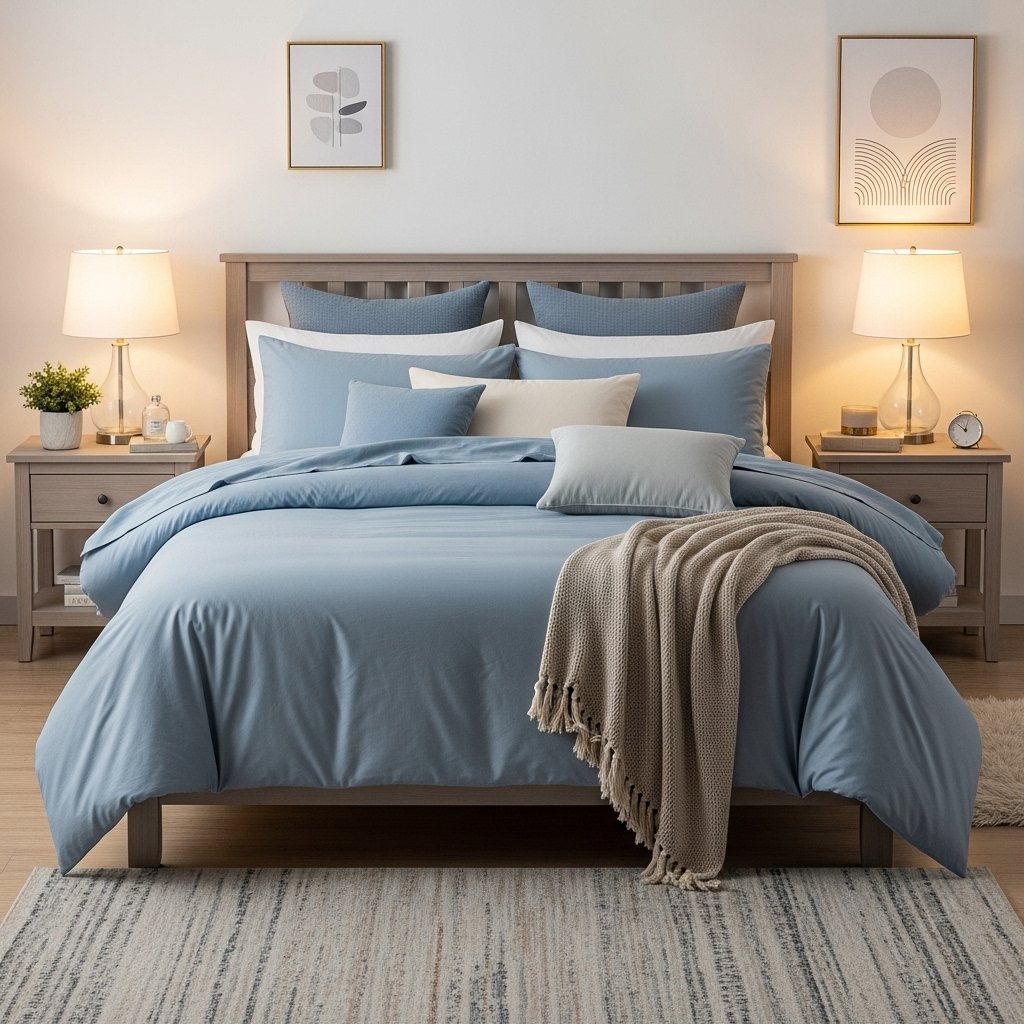 Blue bedding is a simple yet powerful way to introduce color into your room decor. Soft blue bed sheets, pillowcases, and comforters create a calming and restful sleeping environment. You can mix different shades of blue for a layered and aesthetic look. Pairing blue bedding with neutral or wooden furniture enhances the overall cozy vibe. This idea is perfect for creating a relaxing bedroom atmosphere.