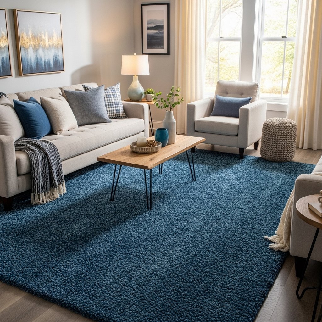 A blue rug can anchor your room and tie all the elements together. Whether you choose a solid blue rug or one with patterns, it adds warmth and texture to your space. Rugs are especially useful in defining areas within larger rooms. A soft blue rug can make your room feel more inviting and comfortable. This simple addition enhances both style and functionality.
