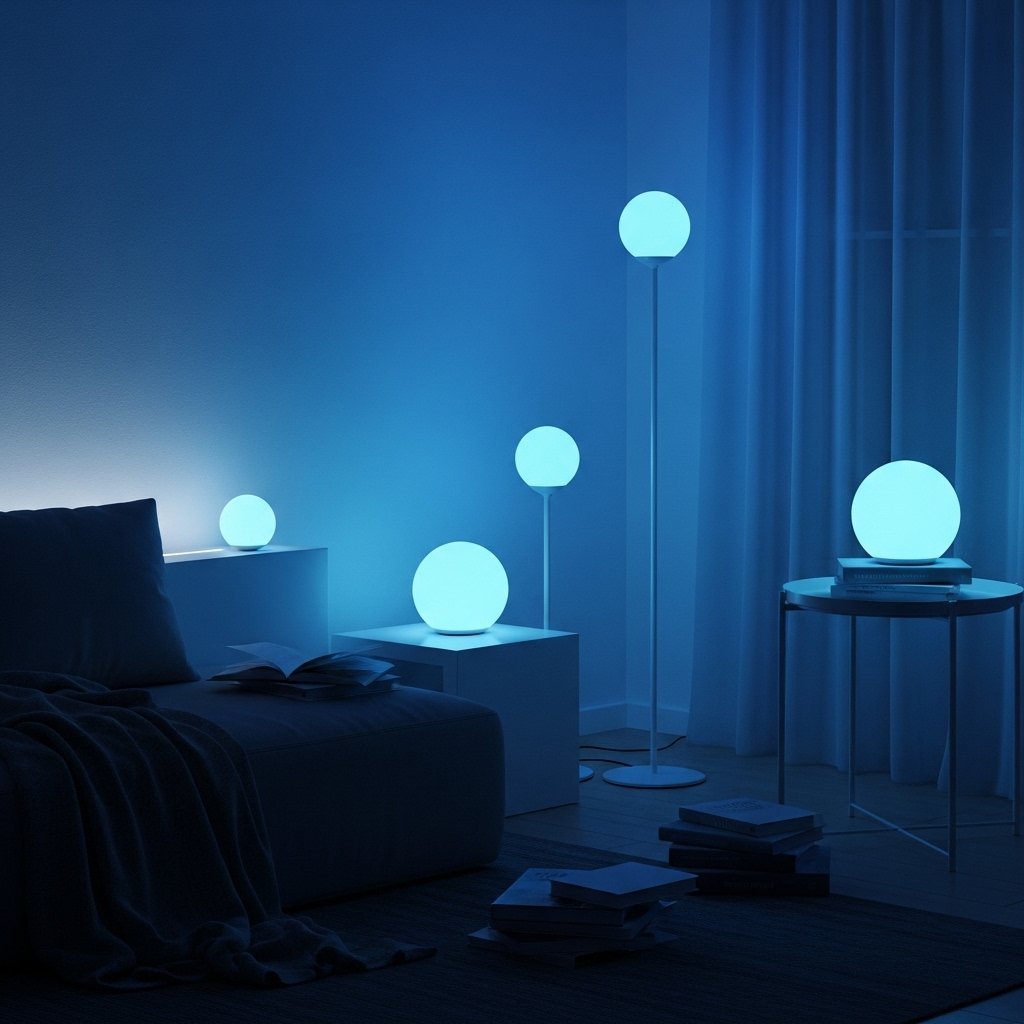 Lighting plays an important role in room decor, and blue-toned lamps or light fixtures can create a calming ambiance. Soft blue LED lights or lamps with blue shades give your room a dreamy and relaxing glow. This is especially effective for bedrooms or reading corners. You can use smart lighting to adjust the brightness and color tone as needed. Blue lighting enhances the mood and adds a modern touch.