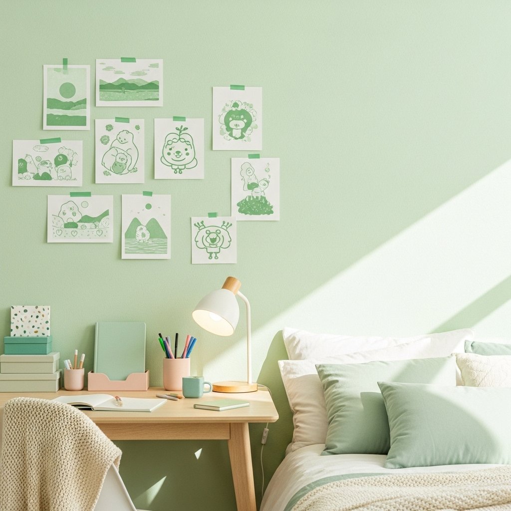 Korean aesthetic decor often features pastel greens and delicate artwork. Choose soft illustrations, clouds, flowers, and gentle patterns in pale green tones. Arrange them loosely with tape or clips instead of frames for a casual look. This style feels youthful, cozy, and trendy on social media. It works perfectly for bedrooms and study spaces.