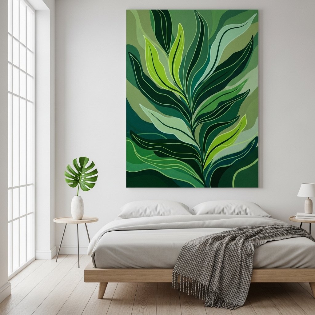 Instead of many posters, use one large green art print as a statement wall feature. Oversized botanical art or abstract green paintings instantly draw attention. Keep surrounding decor minimal so the artwork stands out. This method works well in modern and minimalist interiors. It provides impact without visual clutter.