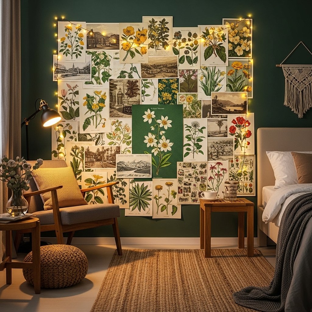 A vintage collage wall combines dark green tones with retro posters, postcards, and artwork. You can mix old botanical drawings, museum prints, and faded photography for nostalgic charm. Overlapping edges slightly creates a relaxed and artistic appearance. Warm lighting, like fairy lights, complements this aesthetic beautifully. The overall look feels cozy and story-filled rather than perfectly symmetrical.