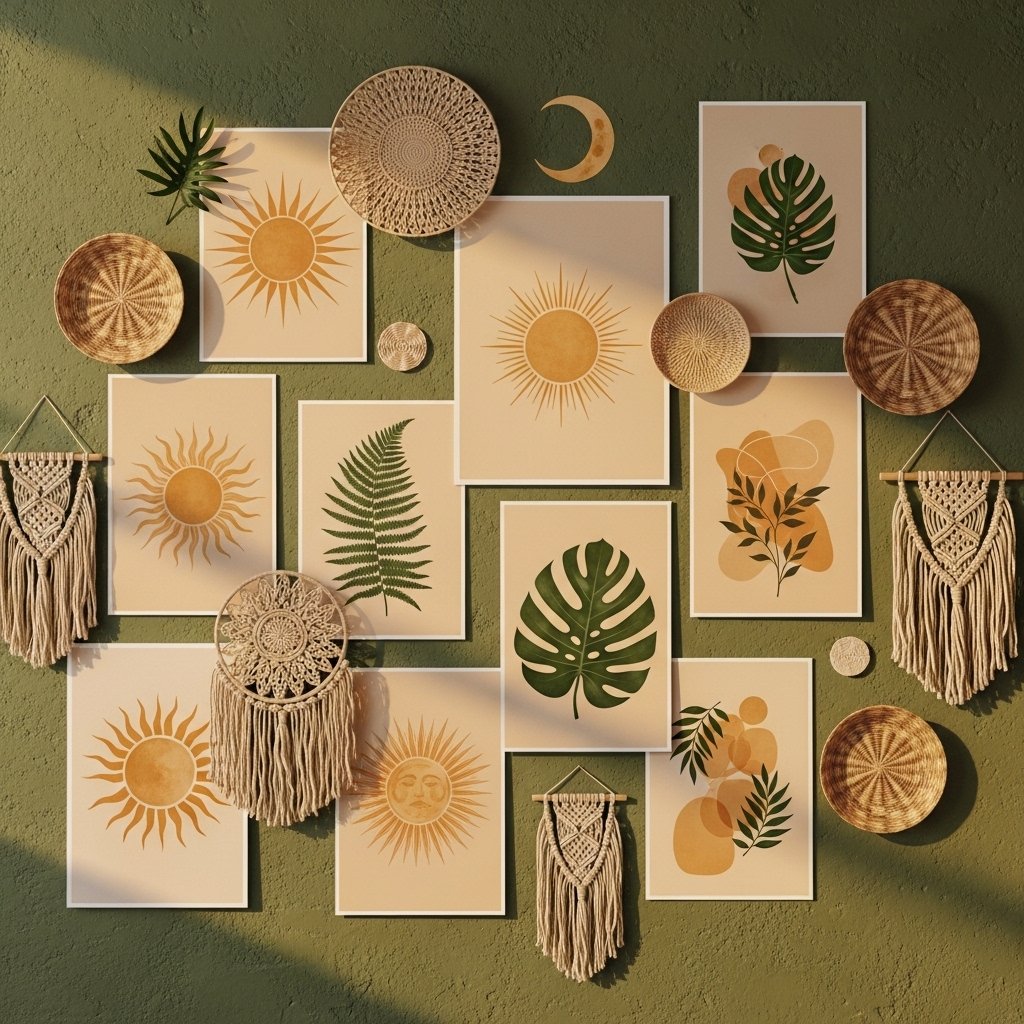 A boho green poster wall mixes earthy greens with beige and warm neutrals. Posters featuring plants, suns, moons, and organic shapes fit perfectly within this theme. Add macrame hangings or woven textures around the prints for depth. The layered textures make the room feel cozy and artistic. This style is ideal for relaxed, creative personalities.