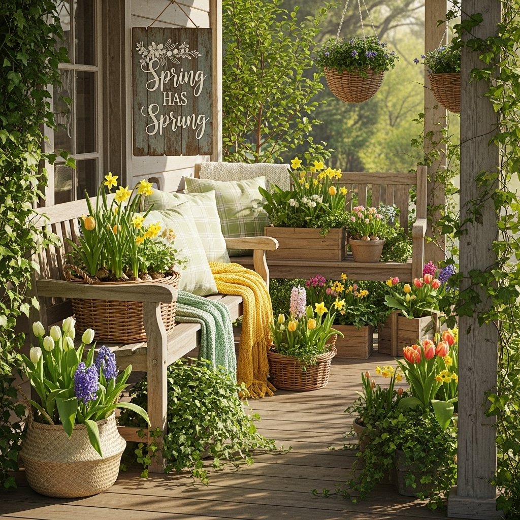 Your porch is the perfect place to highlight rustic spring decorations. Wooden benches, woven baskets, and potted plants create a welcoming outdoor space. Adding a rustic welcome sign or wooden planter box enhances the farmhouse charm. Soft outdoor cushions or plaid blankets make the space feel cozy and inviting. Decorating your porch for spring helps extend the seasonal atmosphere beyond the interior of your home.