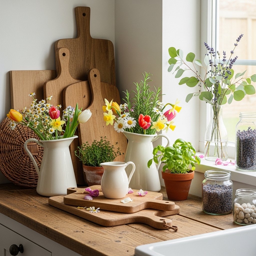 Refreshing your kitchen with rustic spring décor can make the heart of your home feel even more inviting. Display wooden cutting boards, ceramic pitchers, and small herb plants on countertops or open shelves. Fresh greenery or flowers placed near windows brighten the space naturally. Simple decorative touches like vintage jars or woven baskets add warmth and character. These small updates make your kitchen feel fresh, functional, and seasonally inspired.