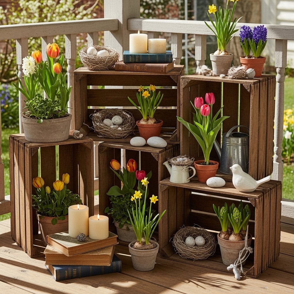 Vintage wooden crates are both decorative and functional when styling rustic spring décor. These crates can be stacked or placed individually to hold potted plants, books, or seasonal decorations. The aged wood texture adds character and authenticity to any room. You can place them in living rooms, entryways, or even outdoor patios for a charming farmhouse look. Wooden crates are versatile and easily adaptable for different spring decorating themes.