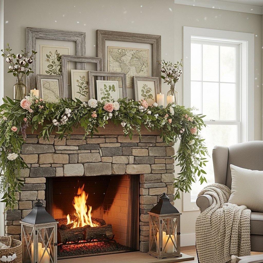Decorating your mantel with rustic spring elements can transform the entire living room. Use natural greenery garlands combined with wooden frames or vintage lanterns for a balanced display. Soft pastel flowers or cotton stems add seasonal brightness without overwhelming the rustic style. Layering different textures such as wood, metal, and greenery creates depth and visual interest. This arrangement gives your living room a fresh seasonal update while maintaining a cozy rustic atmosphere.