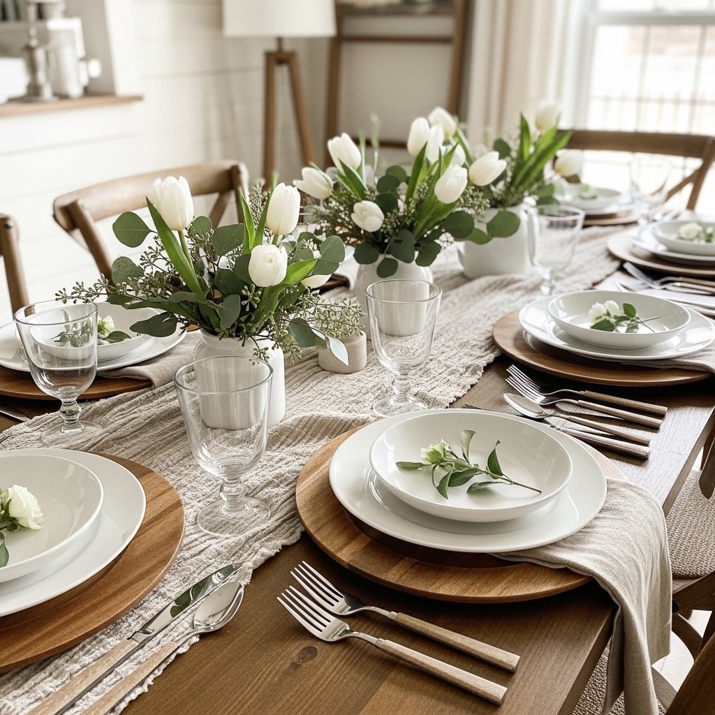 A farmhouse-inspired spring table setting combines rustic textures with fresh seasonal colors. Use linen table runners, wooden chargers, and ceramic plates to create a simple yet elegant dining setup. Small floral arrangements or greenery sprigs placed at each setting add a delicate spring touch. Neutral tones like beige, white, and soft greens keep the look natural and calming. This decorating idea is perfect for spring brunches, family dinners, or small gatherings.