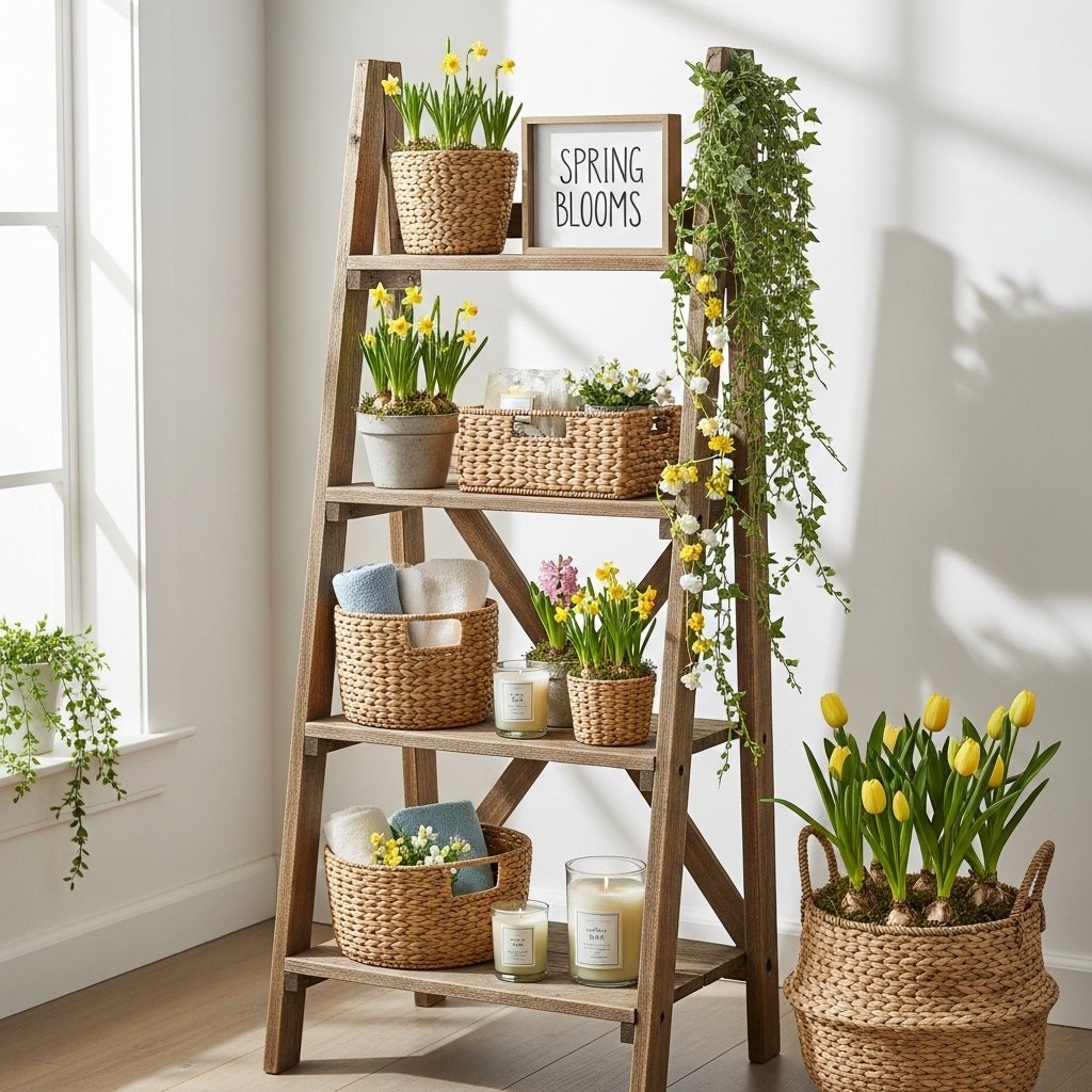 A wooden ladder shelf is a charming way to display rustic spring decorations throughout your home. You can decorate each tier with potted plants, small baskets, candles, or vintage-inspired signs. Soft pastel accents mixed with natural wood textures create a balanced spring look. Adding trailing greenery or floral garlands enhances the seasonal feel. This vertical decorating option is perfect for small spaces while still making a stylish statement.
