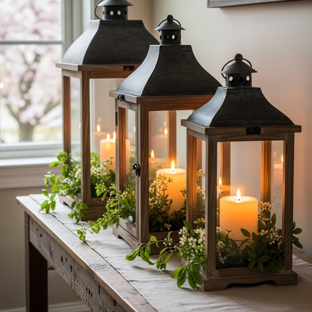 Rustic lanterns make beautiful decorative pieces for both indoor and outdoor spring styling. Place candles inside lanterns and surround them with fresh greenery or small flowers for a natural touch. Wooden or metal lanterns with distressed finishes complement rustic interiors perfectly. These lantern displays look wonderful on entryway tables, porches, or coffee tables. The warm candlelight combined with greenery creates a peaceful and inviting spring atmosphere.