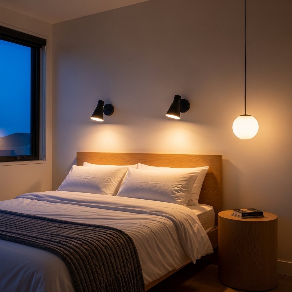Wall-mounted lighting saves valuable surface space in compact bedrooms. Sconces or pendant lights eliminate the need for bulky bedside lamps. Soft warm lighting enhances coziness while maintaining a modern minimalist look. Adjustable fixtures provide both function and ambiance. Keeping lighting simple and streamlined contributes to a peaceful bedroom atmosphere.