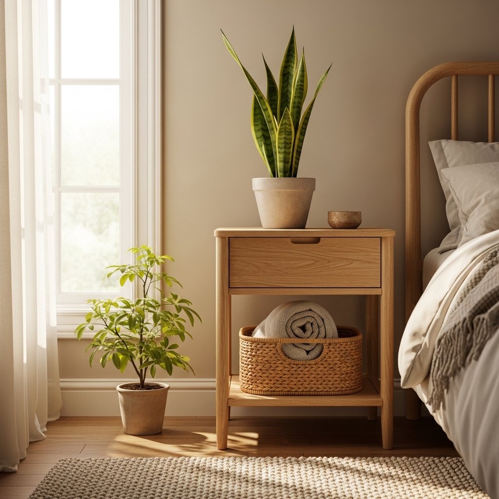 Natural materials bring warmth and texture to minimalist bedroom designs. Wooden nightstands, woven baskets, and indoor plants soften clean lines. Even one small plant can make a space feel alive and welcoming. Organic textures prevent the room from feeling overly stark. Incorporating nature is an easy way to balance simplicity with comfort.