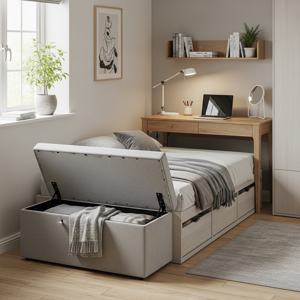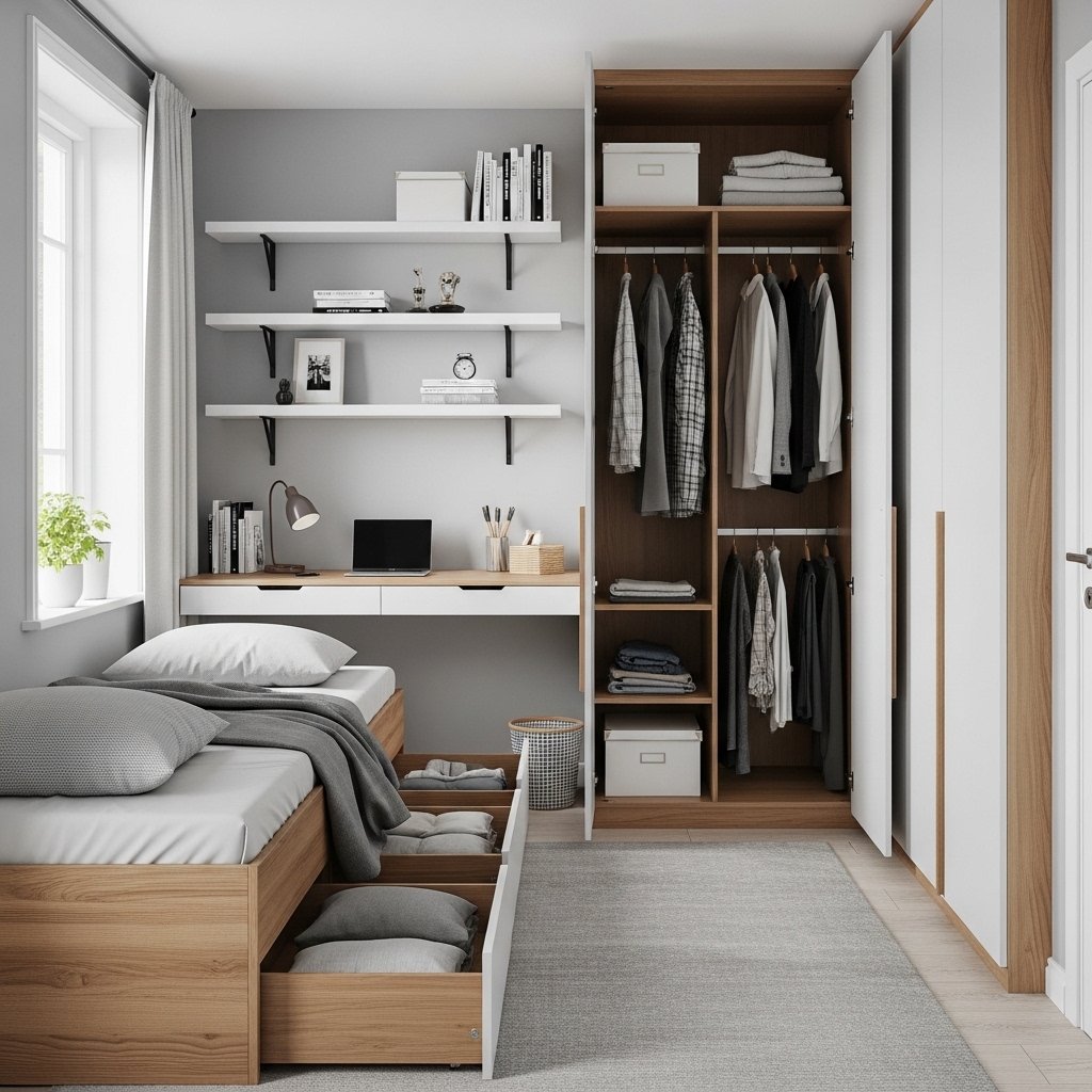 - Organize Smartly – Use storage boxes, under-bed space, and shelves to keep everything in place.