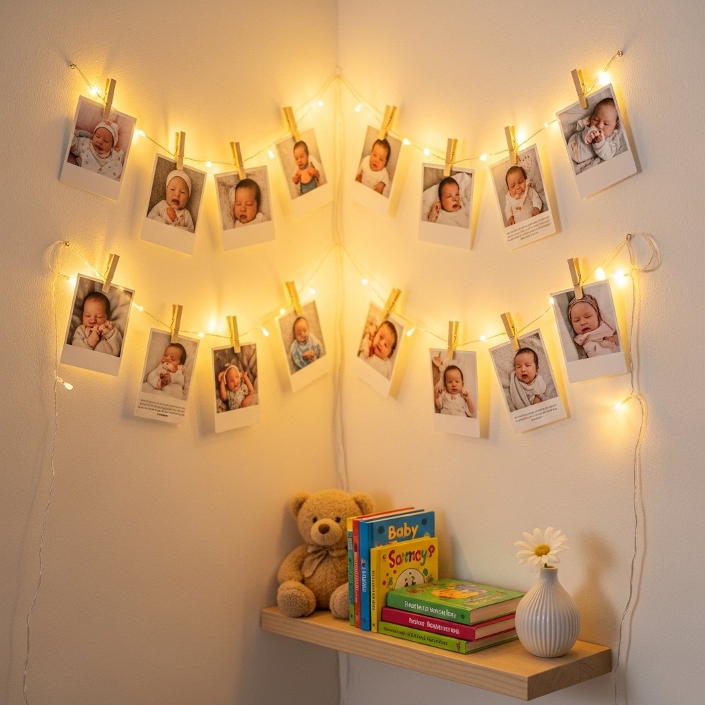 A baby photo display corner adds a personal and emotional touch to the nursery. You can use string lights, clips, or simple frames to display baby pictures or milestone moments. Arranging photos creatively makes the room feel more meaningful and unique. This idea is easy to update as your baby grows and new memories are created. It’s a simple decor piece that turns your nursery into a memory-filled space.