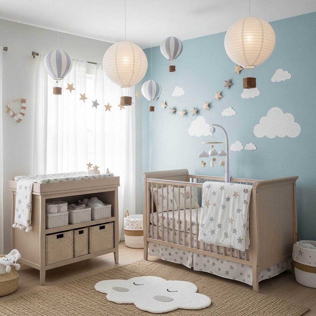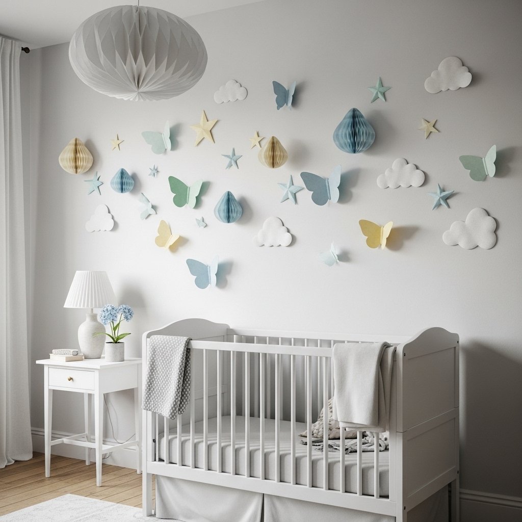 Paper crafts are among the easiest DIY baby room decor ideas you can try at home. You can create paper butterflies, hearts, stars, or clouds and arrange them on the wall in a soft pattern. Using pastel or neutral colors keeps the room calming and visually appealing for a baby. These decorations are lightweight, easy to replace, and safe for nursery walls. This idea works especially well if you want to refresh the room frequently without spending much.