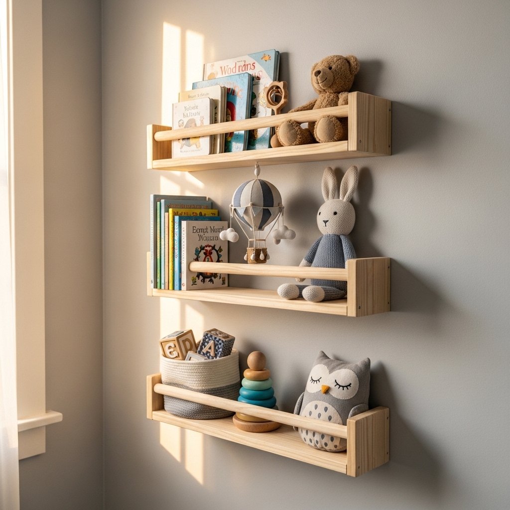 Simple DIY wall shelves can instantly improve both decor and functionality in a baby’s room. You can use wooden planks, floating shelves, or even repurposed crates to create stylish storage. These shelves are perfect for displaying baby books, toys, or small decorative items like stuffed animals. Painting them in soft tones or leaving them natural adds to the cozy nursery aesthetic. This idea combines practicality with style, making it a must-have for small or organized spaces.