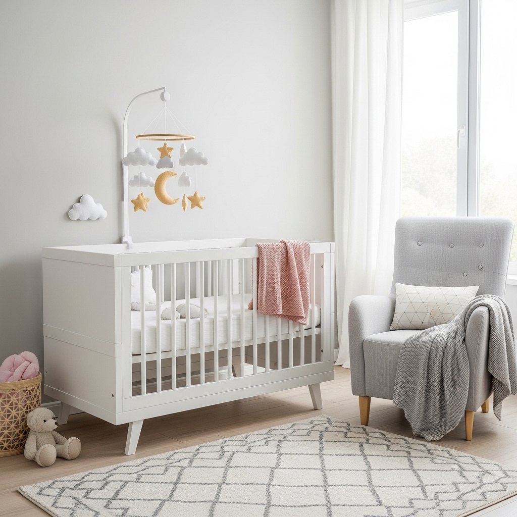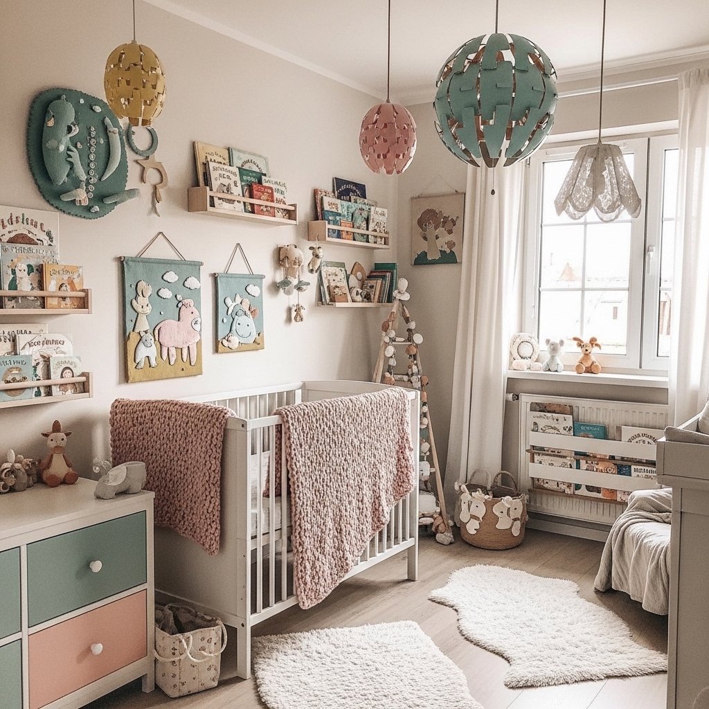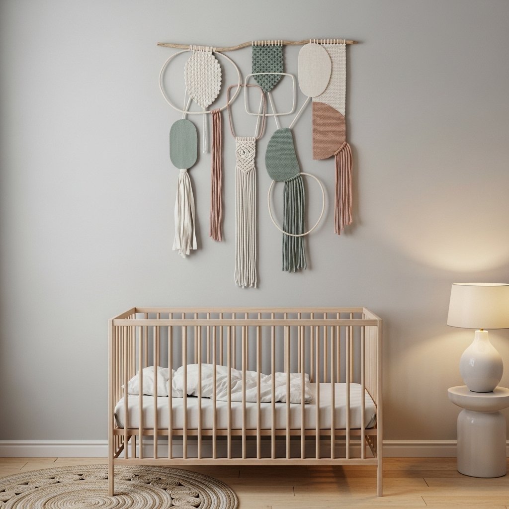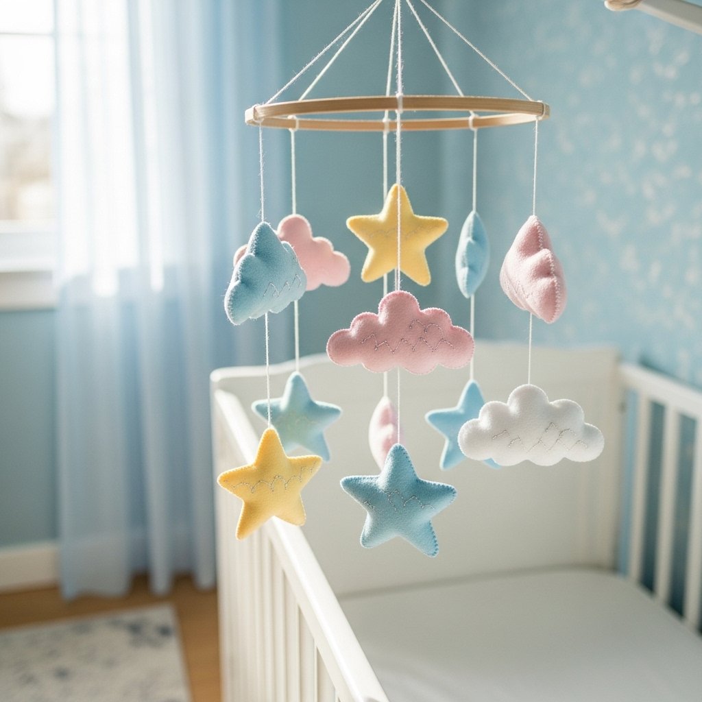 A crib mobile is a classic nursery decor item that you can easily make at home. Using materials like felt, fabric, or paper, you can create shapes such as stars, animals, or clouds. Hanging them from a simple hoop or frame adds a soft and dreamy touch above the crib. This DIY project is not only decorative but also engaging for babies as they watch the gentle movement. It’s an affordable way to create a soothing and visually stimulating environment.