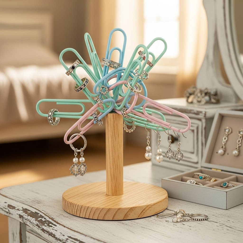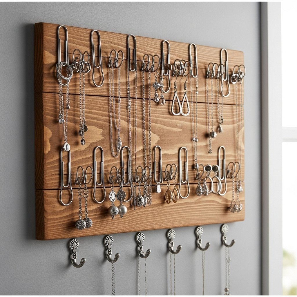 A paper clip jewelry organizer is a smart way to keep your earrings and necklaces untangled. Use large paper clips and attach them to a wooden board or a frame. Hang your jewelry pieces from the clips, and you have a stylish display that also keeps your accessories easy to access. This decor idea is especially useful for small rooms where storage space is limited. You can also decorate the board with paint or washi tape for a colorful finish.