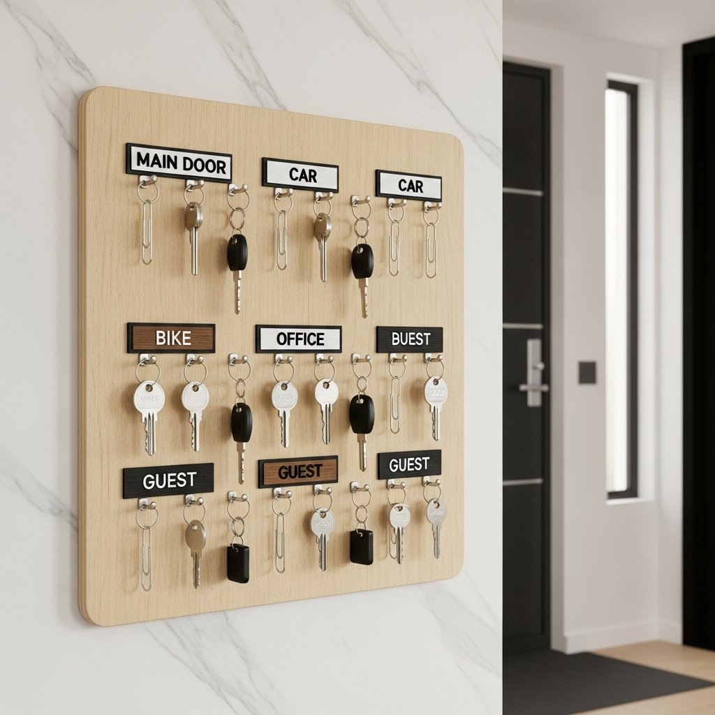 A paper clip key holder is a practical DIY decor project that helps you stay organized. Attach a row of large paper clips to a wooden board or a frame and use them to hang your keys. You can also add small labels or decorations to personalize the board. This idea is especially useful near the room entrance or beside your study desk. It keeps your keys in one place and adds a neat decor touch to your space.