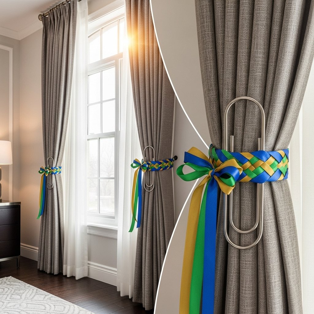 Paper clip curtain tiebacks are a quick and easy way to style your curtains without spending money. Use large paper clips and wrap them around the curtain fabric to hold it in place. You can also decorate the clips with ribbon or paint for a more elegant look. This DIY is perfect for lightweight curtains and can be changed easily whenever you want a new style. It adds a modern and trendy touch to your room instantly.