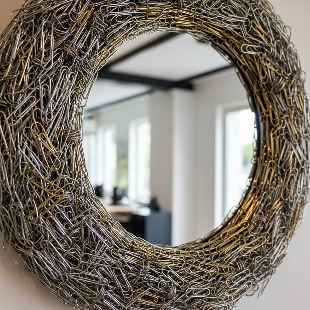 A paper clip wall mirror frame is a creative way to upgrade a plain mirror. Attach paper clips around the edges of the mirror using glue or tape. You can arrange them in a pattern or keep them simple for a minimal look. This DIY adds a unique and artistic touch to your room decor. It’s also an affordable way to refresh an old mirror and make it look stylish.