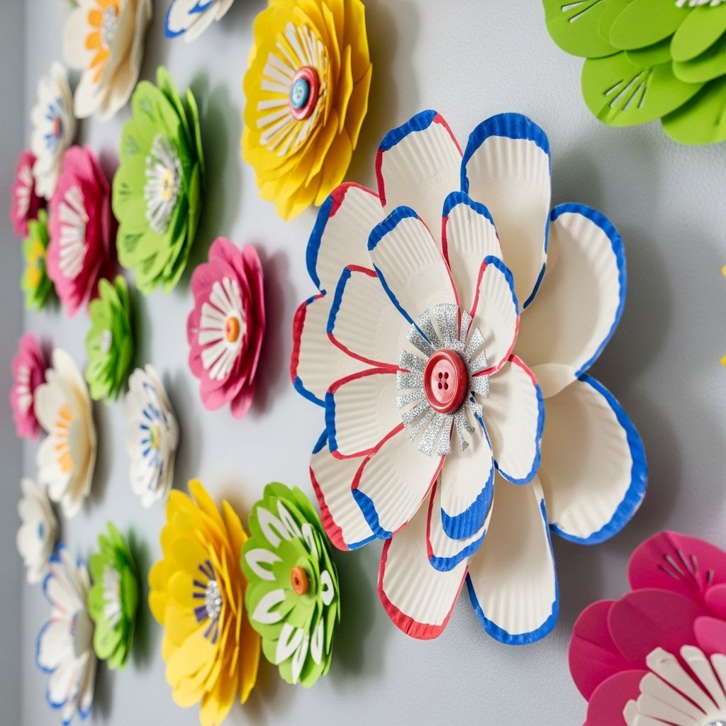 Paper plate wall flowers are a quick and eye-catching room decoration. To make them, cut the edges of paper plates into petal shapes and paint them in bright colors. You can layer multiple plates to create depth and attach them with glue or tape. Adding a glitter center or a small button makes the flower look more realistic. This decor idea looks great on a plain wall and instantly brightens up the room.