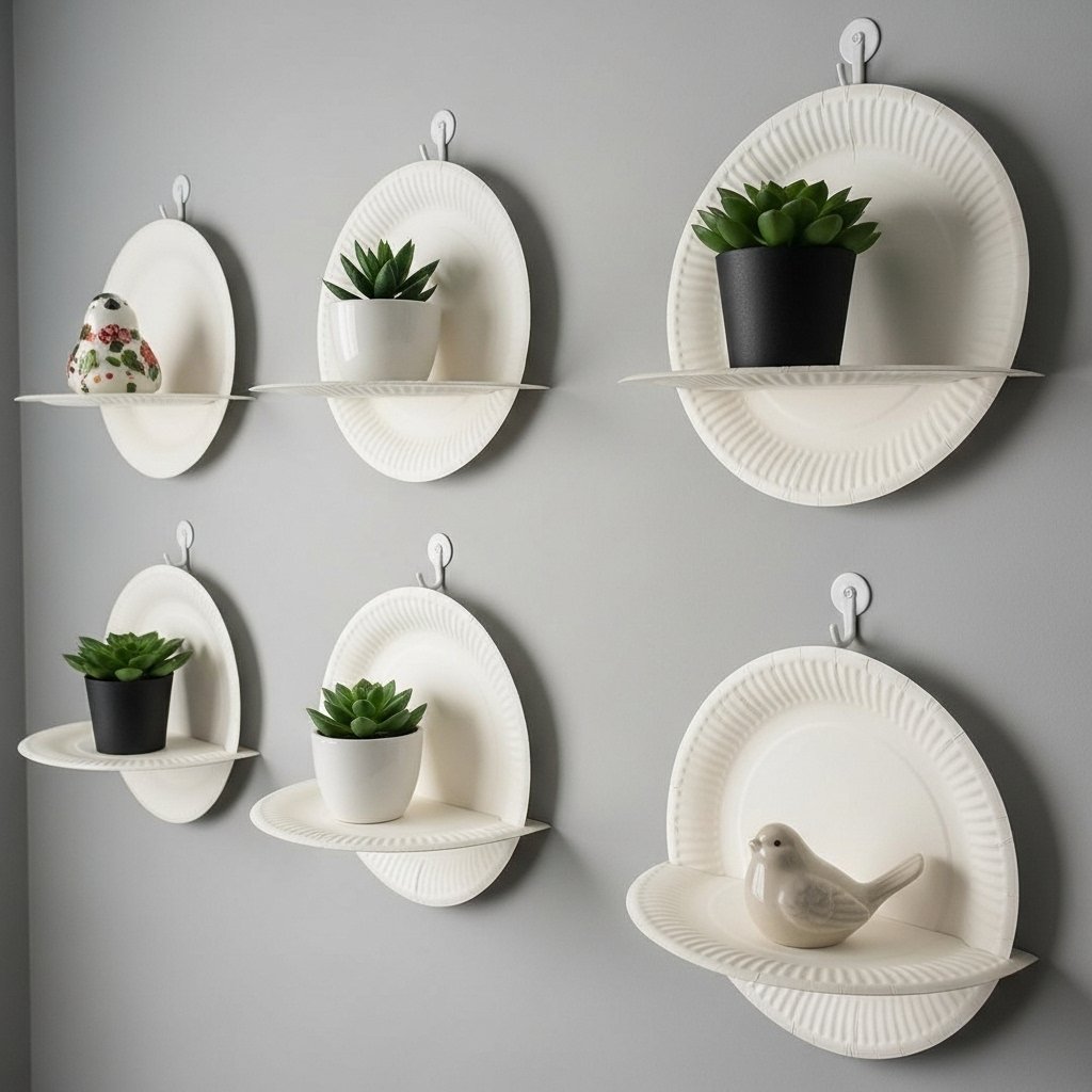 Paper plate floating shelves are a creative way to display lightweight items. Glue two paper plates together for extra strength and paint them to match your room. Attach small wooden blocks or cardboard strips to the back for support. Mount them on the wall using adhesive hooks or nails. These shelves are perfect for holding small plants, candles, or decorative items.