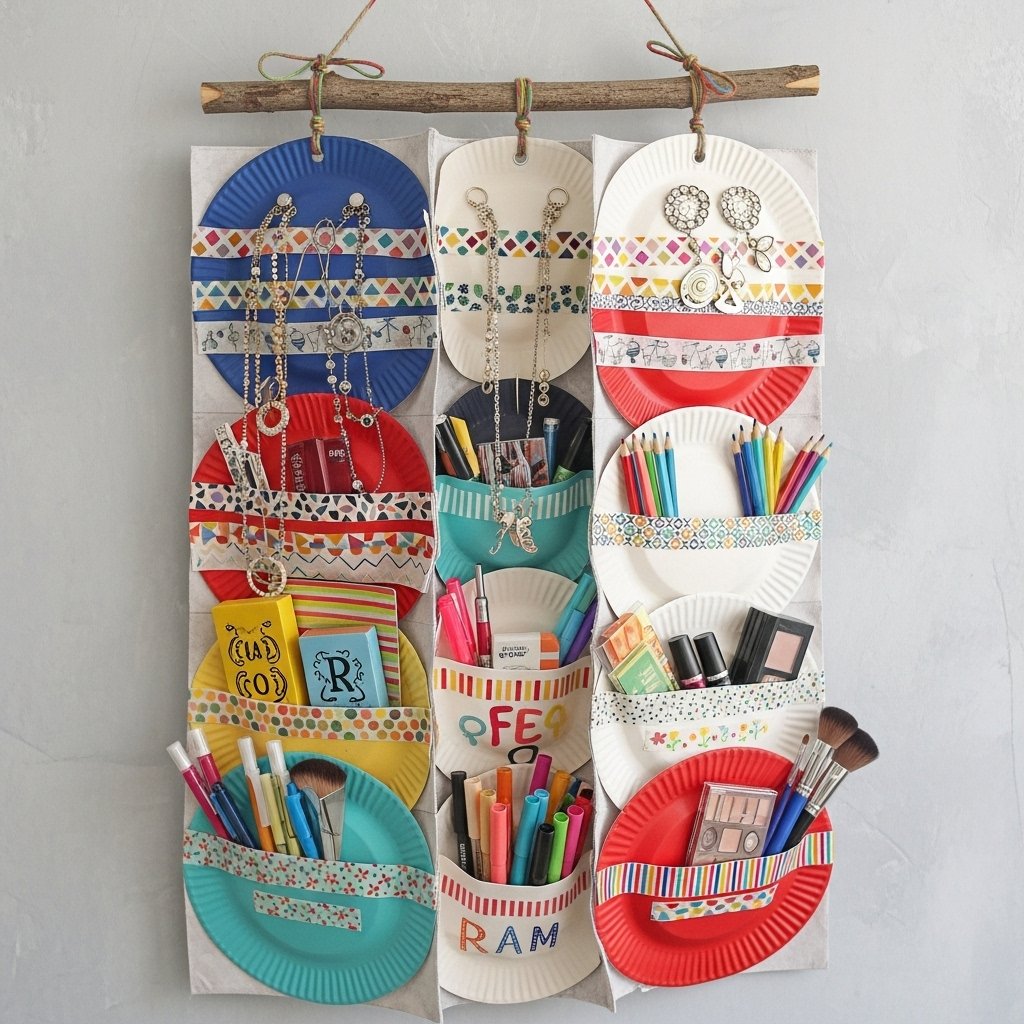 A paper plate hanging organizer is a practical and stylish way to store small items. Fold a plate in half and decorate the outer side with paint or washi tape. Attach pockets using additional paper plates or fabric and glue them in place. Hang it on the wall using string or a hook. This organizer is perfect for storing jewelry, stationery, or makeup essentials.