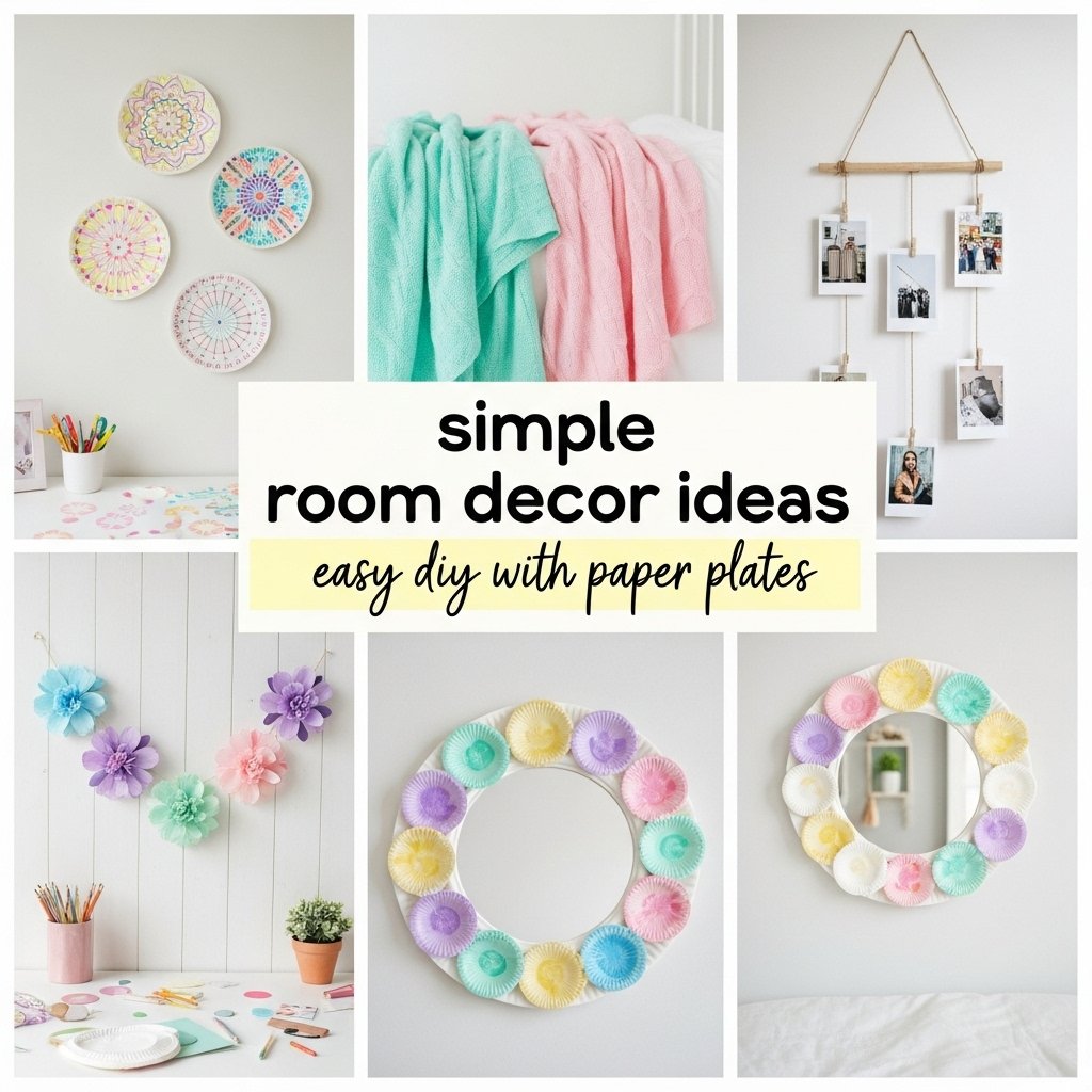 Simple room decor ideas using paper plates include making wall flowers, decorative faces, sunburst designs, and hanging art pieces. Paper plates are easy to cut, paint, and decorate, which makes them perfect for quick DIY projects. These ideas help decorate a room in a creative way without using expensive materials.