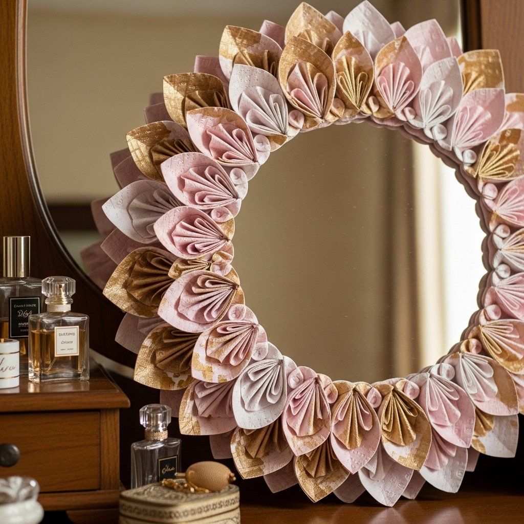 A paper towel mirror border is a creative way to decorate plain mirrors. Paper towels can be folded into petal shapes and arranged around the mirror edge. Once secured and painted, the mirror looks like a decorative statement piece. This DIY room decor idea is perfect for dressing tables or vanity areas. It adds charm and elegance without spending extra money.