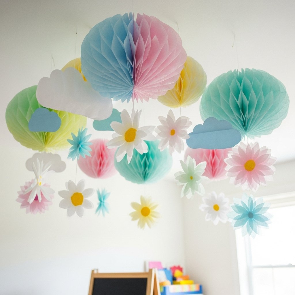 Paper towel ceiling decor accents can completely change the look of a room. Lightweight paper towel designs can be shaped into clouds, flowers, or abstract forms and attached safely. These accents work especially well for kids’ rooms or creative spaces. Soft white or pastel colors enhance the dreamy effect. This decor idea adds visual interest to often-overlooked ceiling areas.