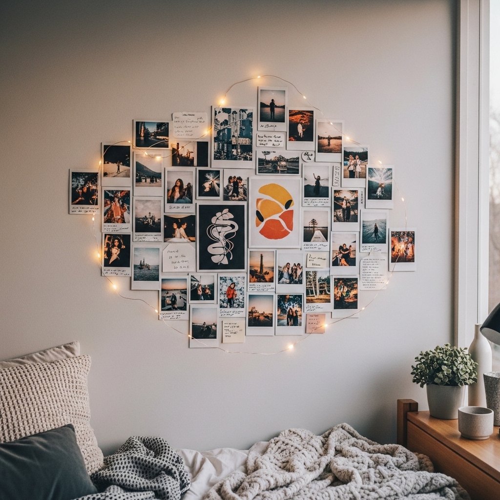 Creating a photo wall collage is a meaningful way to personalize your room decor. You can print your favorite memories, aesthetic pictures, or inspirational images and arrange them creatively on your wall. Many DIY enthusiasts in the USA use grids, heart shapes, or random layouts for a trendy look. Adding fairy lights or clips can enhance the overall aesthetic. This decor idea is especially popular in bedrooms and dorm rooms.